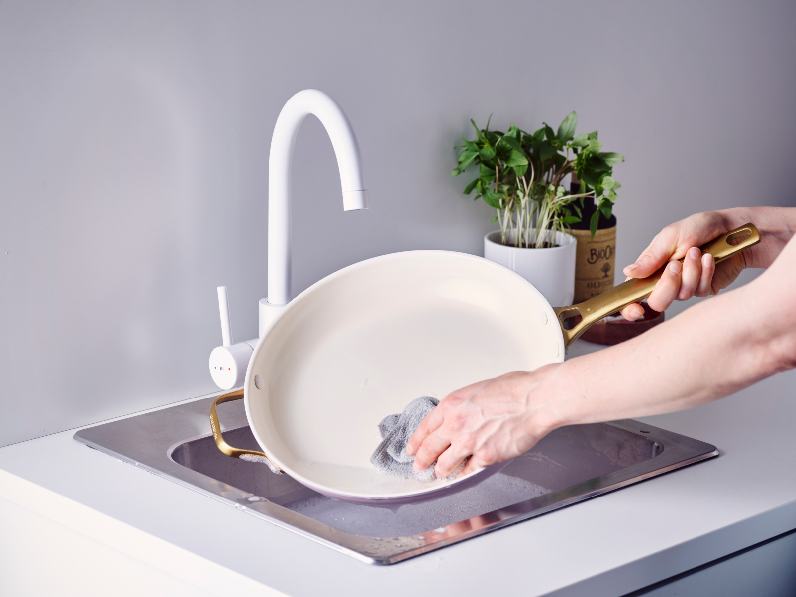 If your pan gets a little too hot your oil can burn, which creates sticky spots on your pan. But don't worry, you can get rid of them with a melamine sponge and a bit of water. To avoid burning oils altogether, you should cook on low to medium heat and use an oil with a high smoke point like avocado oil, canola oil, or grapeseed oil.