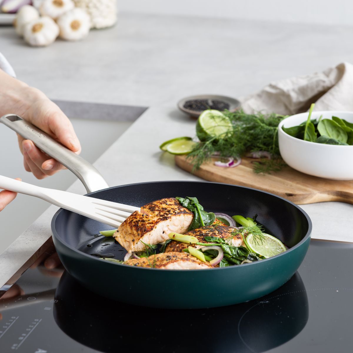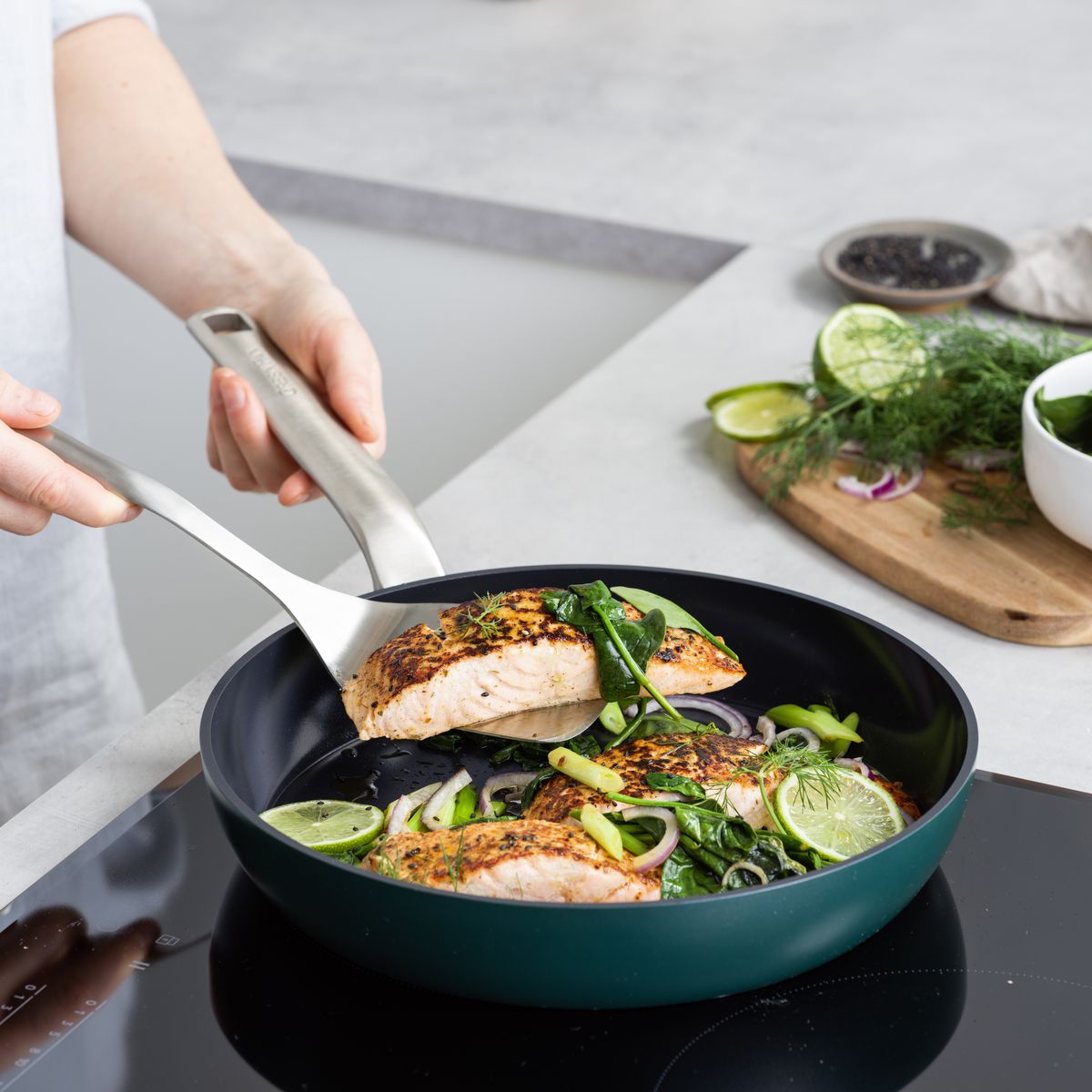 GreenPan Evolution 系列專為追求卓越品質與時尚美學的廚房設計。採用領先的 Thermolon™ 陶瓷不沾塗層並增強鑽石成分,具備極致的耐磨性與導熱效率。獨家 Balance Pro 技術確保鍋底受熱時保持平整,讓食油分佈均勻,完美應對每一道料理,是現代健康烹飪的首選。